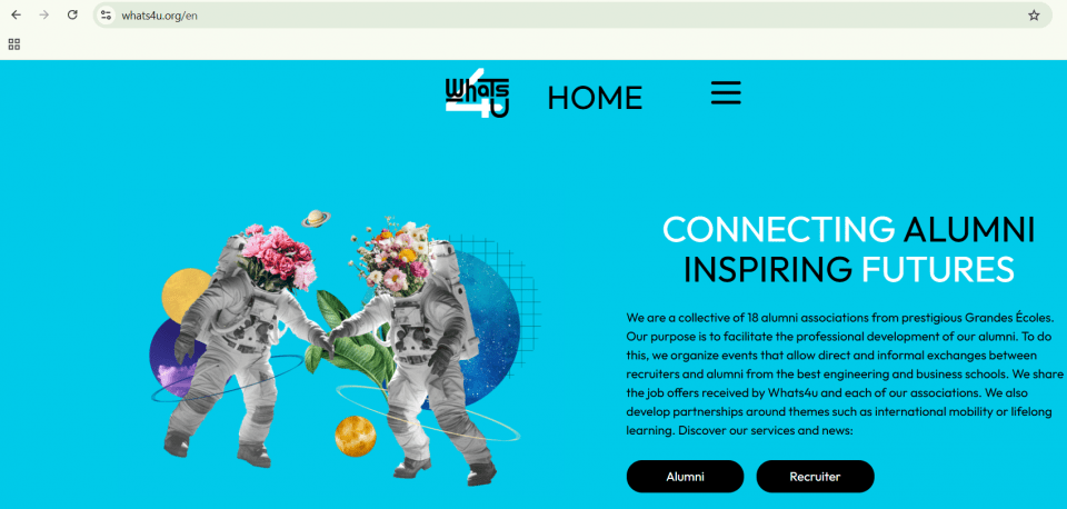 The purpose of Whats4u is to facilitate the professional development of alumni of our schools. To do this, we organize events allowing direct and informal exchanges between recruiters and alumni of the best engineering and business schools.