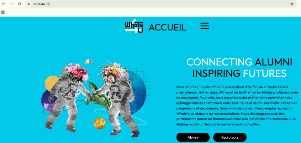 La raison d’être de Whats4u est de faciliter les évolutions professionnelles des alumni de nos écoles. Pour cela, Whats4u organise des événements permettant des échanges directs et informels entre recruteurs et alumni des meilleures écoles d’ingénieurs et de business.