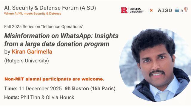 The AISD Forum 🤖 ⋂ 🛡️ (AI, Security & Defense) cordially invites you to a special public presentation by Kiran Garimella (Rutgers University) on the practices of studying disinformation and community dynamics on WhatsApp. This event is a part of AISD's Fall '25 series on "Influence Operations".