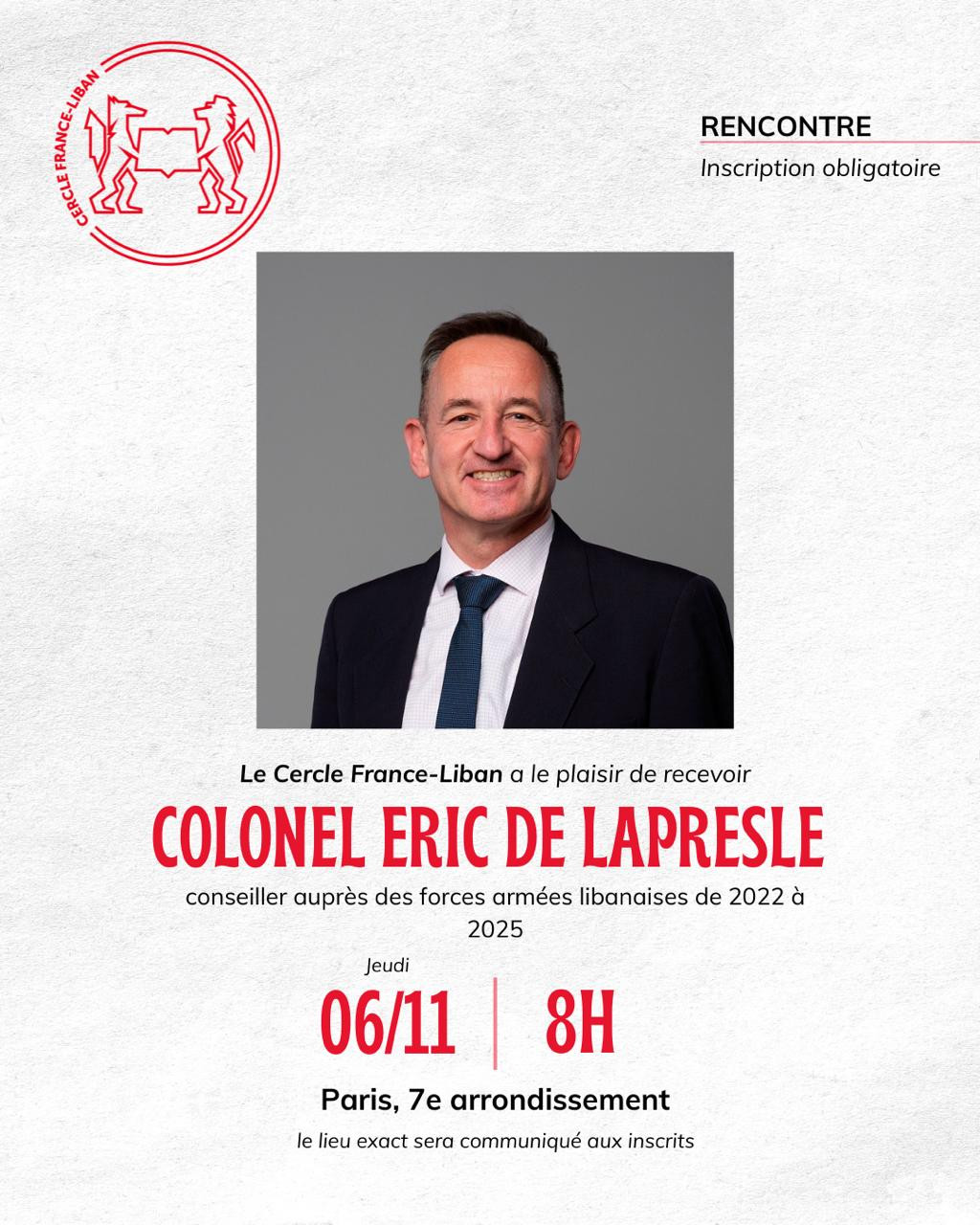 Le Cercle France-Liban de Sciences Po Alumni a le plaisir de vous convier à une rencontre avec le Colonel Éric de Lapresle, conseiller auprès des Forces armées libanaises de 2022 à 2025.