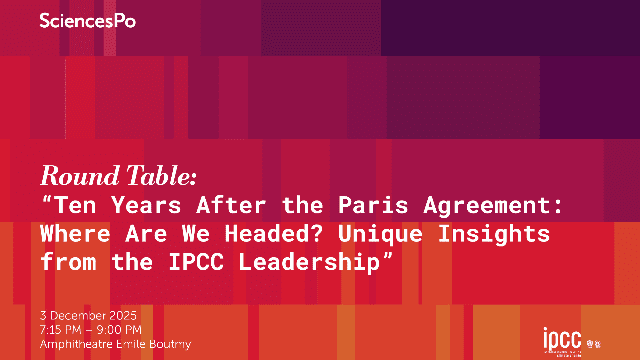 With the IPCC preparing for its first-ever joint Lead Author Meeting, Sciences Po and the IPCC are co-hosting a landmark roundtable on December 3 at 7:15pm to reflect on the progress made since the Paris Agreement, highlight ongoing challenges, and explore pathways for effective global climate action.
